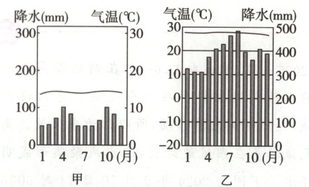 材料二 下图为哥伦比亚地形示意图,甲、乙为图中两城市的气候资料。