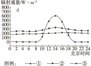 1 A 只有白天才有太阳辐射且从日出—正午—日落,太阳辐射强度先增大后减小且正午时达到最大,①曲线代表太阳辐射;一天中地面吸收太阳辐射后向外辐射能量,其辐射强度变化滞后于太阳辐射。大气吸收地面长波辐射而增温的同时,其射向地面的长波辐射部分被称为大气逆辐射,因此,大气逆辐射通量小于地面辐射。②曲线代表地面辐射、③曲线代表大气逆辐射,A正确。