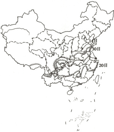 4 D 从14日到20日,霜冻线向南移动,移至浙江、江西等地,可能是受北方冷空气南下影响,南方出现降温现象,图示月份最可能是冬季即12月。