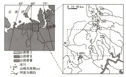 材料 下图为“亚欧大陆某区域自然带及该区域局部冰川、河流分布图”。