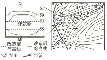 2 B 由题左图中建筑物的北侧(N侧)改造后等高线向高值处凸出、南侧(M侧)改造后等高线向低值处凸出,可判断建筑物N侧地表向下挖低、M侧地表向上填高,则B正确。