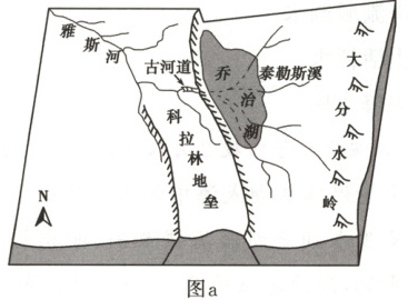 (1)古河道原为古雅斯河的上游河段,河流从东向西流,经过河流侵蚀、搬运、沉积形成古雅斯河道;后由于太平洋板块和印度洋板块碰撞挤压,地壳运动,发生断裂抬升,形成科拉林地垒;地垒的形成造成古雅斯河上游河段断流,水分蒸发,形成古河道。
