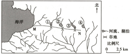 3 A MN一线形成新的分水岭,造成①②湖泊南部河道改向,该处应为断裂带,且MN一线南部地势相对抬升,形成分水岭,北部相对沉降,积水成湖;如果发生褶皱,不会保持原有的水系形态完整。