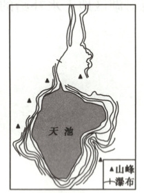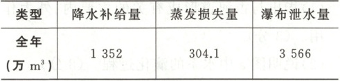(2025 泰州期初,7—9)长白山天池(白头山天池)是火口湖,湖面平均海拔 2 155 m,四周山峰环绕,基本没有坡面径流注入,湖水通过北侧阀门以瀑布形式排水。长白山林线大致 1 900~2 000 m。下表是天池部分水量统计数据,下图为天池示意图。据此完成下面三题。