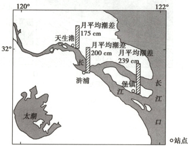 (2024安徽,15,3分)潮差是指潮水的一次涨落过程中最高水位与最低水位之差。下图为2024年4月上海堡镇、苏州浒浦、南通天生港三地的月平均潮差。据此完成下题。