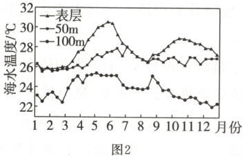 2.图2中7—8月份表层与50m深度海水温度相近,主要是因为 (
