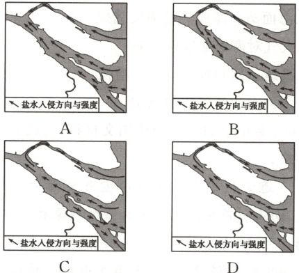 1 B 由材料可知,图示区域表层水体氯度受盐水入侵影响,所以表层水体氯度减小的方向即盐水入侵的方向。由图可知,图示时间盐水入侵路径最可能是B。