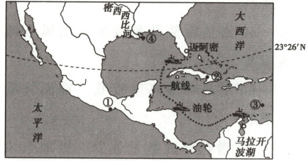 (2025镇江期初,10—12)海洋焦油是石油及其炼制品在开采、炼制、贮运等过程中进入海洋环境而造成的污染,在洋流和风力作用下扩散显著,易在海滩反复积累,严重威胁地区社会经济发展。泛加勒比海地区受海洋焦油污染显著。下图为“泛加勒比海区域示意图”。据此回答下面三题。