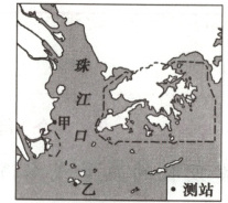 (2025南通一调,13—15)某科研团队于2018年5~7月对珠江口附近海域水文要素进行了实测。该海域在5月10日出现表层海水盐度骤降的现象,随后乙测站的盐度逐渐回升,但甲测站回升幅度很小。下图为“甲、乙测站位置示意图”。据此完成下面三题。