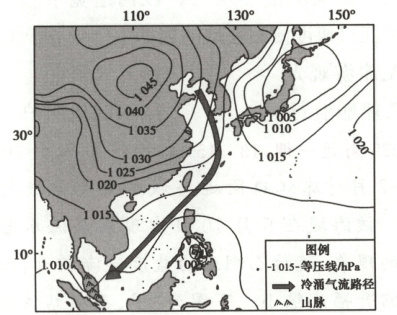 (1)影响风的因素主要有水平气压梯度力、摩擦力、风力通道等。结合图中冷涌气流源地等压线密集可知,形成风的水平气压梯度力大;读图可知,冷涌气流的路径主要在海洋上,摩擦力小,南下过程中风力损耗较小;另外,冷涌气流在经过大陆、岛屿之间的相对狭窄通道时,“狭管效应”会加强风力。