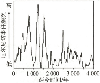 (2023北京,5—6,6分)暴雨引发的洪水挟带泥沙进入湖泊后,沉积形成砂质纹层。某地湖泊中砂质纹层出现频次与厄尔尼诺事件频次正相关。据此推算的厄尔尼诺事件频次如图所示。读图,回答下面两题。