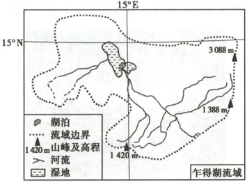 (2025如皋一调,10—11)乍得湖位于撒哈拉沙漠南缘,其水系主要分布于湖泊南部,水位季节变化大。下图为乍得湖流域水系图。据此完成下面两题。