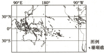 (2025扬州中学2月检测,12—14)造礁珊瑚生活在热带浅海中,在生长的过程中会一层层分泌碳酸钙形成外骨骼。珊瑚对水温变化敏感,有一定的温度适应范围。科学家常钻取珊瑚骨骼岩芯样品,重建古代气候状况。2015年南海东沙环礁近四成珊瑚在厄尔尼诺事件中死亡。下图示意世界某区域珊瑚礁分布情况。据此完成下面三题。