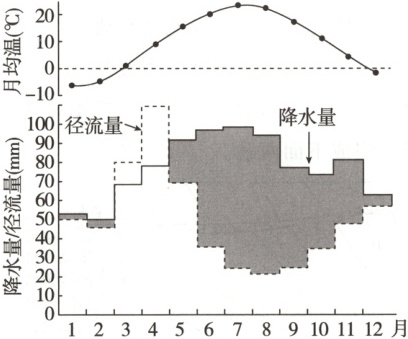 2 C 5~12月的阴影部分=降水量-径流量,径流量+蒸发量=降水量,阴影范围表示流域蒸发量;1~2月的阴影部分=降水量-径流量,因1~2月月均温低于0℃,降水形式主要是降雪,降水量-径流量=积雪量+蒸发量,因冬季蒸发量较小,阴影范围表示流域1~2月的积雪量,5~12月的蒸发量,C项正确。