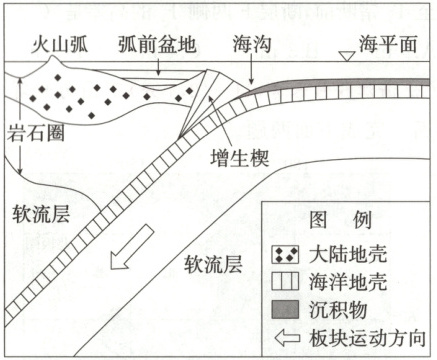 拓展 板块的离散和汇聚是塑造海陆格局和实现大陆地壳生长的重要过程,下图为增生楔(大洋板块俯冲时上部物质被大陆板块刮下来堆积在海沟底部形成楔状体)与弧前盆地形成机制示意图。据此完成下面两题。
