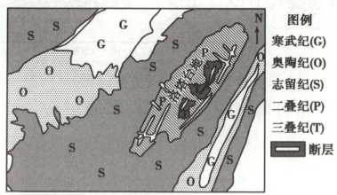 (2024 苏州期末,10—11)某地质勘探队对贺兰山周边进行地质考察,下图是其绘制的考察区域地质构造平面图。读图回答下面两题。