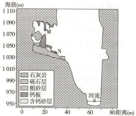 (2025南通二楼,9—11)某峡谷悬崖上有一处大型洞穴,内有滴水。洞穴为河流侧蚀形成,洞内有多种沉积物,其中砾石层是河床沉积物,钙板为洞内薄层水流动形成的碳酸钙沉积物,含钙砂层是被钙质胶结的细砂层。对洞穴内某沉积物进行测龄,可估算其下方河流的下切速率。下图为“该洞穴剖面示意图”。据此完成下面三题。