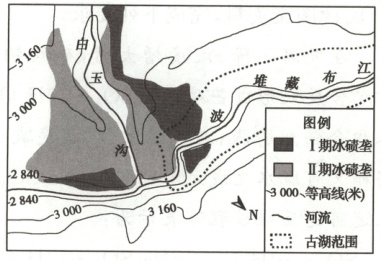 (2025扬州一模,4—6)冰碛垄为冰碛物堆积成的垄岗状地貌,是古冰川前缘曾在此停留的痕迹。波堆藏布江河谷中冰川作用痕迹明显。下图示意波堆藏布江局部区域现代地貌分布示意图。据此完成下面三题。
