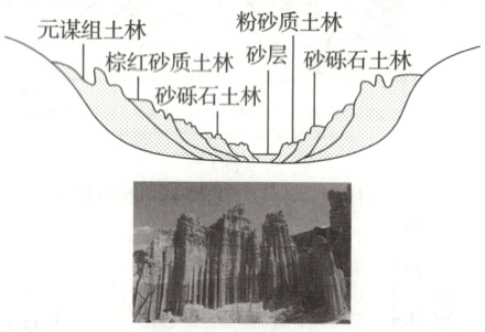 (2025泰州期初,5—6)元谋盆地位于滇中高原北部,金沙江支流龙川江西侧,发育有我国著名的土林地貌。元谋土林由松散河湖相沉积物构成,呈林柱状分布。下图为不同时期的土林地貌发育过程图和土林景观图。据此完成下面两题。