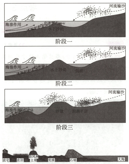(1)入海口河流与海浪相互作用,河流泥沙堆积形成水下沙堤;水下沙堤露出水面,海岸带被沙堤分割的局部海域形成潟湖;输沙作用持续,潟湖被逐渐淤填形成平原。