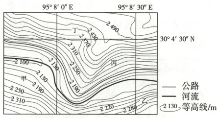 2 C 丙地等高线最密集,坡度最大;同时丙地位于河流的凹岸,河岸冲刷严重,导致潜在滑坡体下方不稳定。丙地下方公路的建设和维护需要人工开挖坡底,也有可能诱发滑坡,故丙地最有可能发生滑坡。