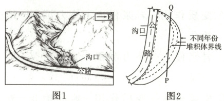 (2023 福建,15—16,6 分)泥石流爆发后,部分物质冲出沟口,沟内残留物质会影响下一次泥石流的冲出量。图 1 示意某条沟及沟口景观。该沟于 2013 年、2019 年和 2020 年爆发了泥石流,沟口冲出量分别为 11.50 万$m^3$、11.91 万$m^3$和 11.04 万$m^3$。引发这三次泥石流的降雨量依次下降。图 2 示意泥石流冲出沟口后的堆积体。据此完成下面两题。
