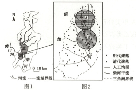 图 1 为滇池流域示意图。海口河为滇池湖水的唯一出口,元代以来多次疏浚。明代,滇池南岸有大量移民迁入,水稻种植面积逐渐增加。清代,人们在柴河下游相继开挖了十余条沟渠。明清时期,柴河三角洲面积显著扩大。图 2 示意明清时期柴河三角洲的聚落分布。