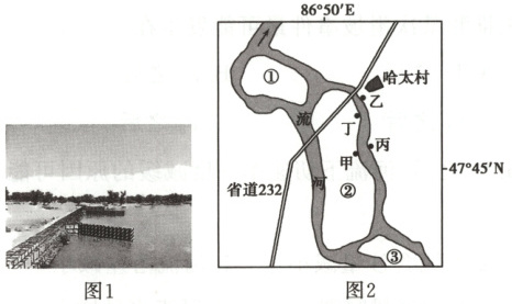 (2025 苏州期末,6—8)丁坝是与河岸正交或斜交伸入河道中的水利工程设施。图 1 为“额尔齐斯河上的丁坝”,图 2 为“额尔齐斯河哈太村段示意图”。完成下面三题。