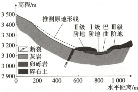 (2025 南京、盐城期末,1—3)郎多二村滑坡位于川西金沙江支流巴曲左岸,斜坡上岩体节理发育,结构破碎。下图为该滑坡区地质剖面图。据此完成下面三题。