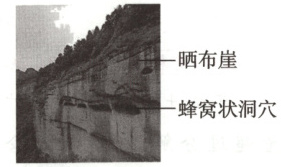 (2025 镇江期初,1—2)丹霞地貌指具有陡崖坡的红层地貌。由于岩性差异,更易风化的岩层在陡崖坡上会形成蜂窝状的天然洞穴。雨季,山顶的流水在崖壁上会侵蚀形成系列近乎平行的竖直细沟,称为“晒布崖”。2010 年 8 月,“中国丹霞”被正式列入世界遗产名录。下图为“AI 生成的我国粤北丹霞山红层地貌景观图”。据此回答下面两题。