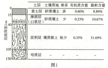 (1)白浆化棕壤土壤黏重,透水性差,根据材料可知,当地降水多且集中,“上砂下黏”的剖面构型会影响土壤中水分的迁移。