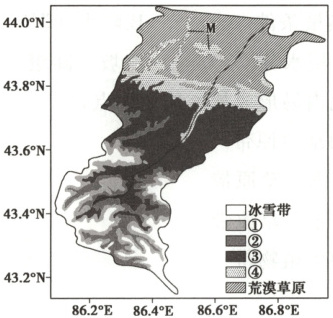 (2025苏锡常镇3月模拟,9—10)呼图壁县位于天山北坡中段,境内海拔360~5 290米,山地、平原、沙漠等地貌景观类型多样,山地自然带垂直分异明显。呼图壁河和雀尔沟河纵贯县境。下图为“呼图壁县南部山区植被分布示意图”。据此完成下面两题。