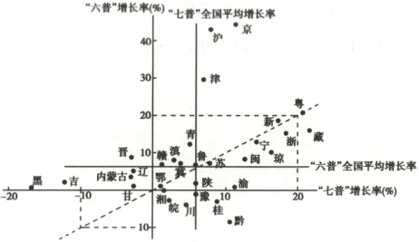 (2022江苏,18,2分)我国于2010年和2020年分别进行了第六次全国人口普查(“六普”)、第七次全国人口普查(“七普”)。下图为“我国大陆31个省、自治区、直辖市‘六普’‘七普’人口增长差异图”。据此回答下题。
