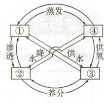 右图是地球圈层间的物质交换示意图,图中①②③④代表四大圈层。读图,回答(1)~(2)题。