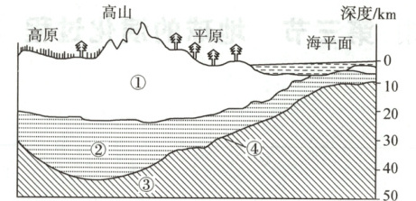 1. 图中①②两层构成地壳,请简要说明地壳的组成和特征。