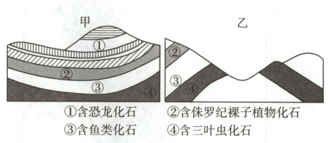 观察发现下图甲、乙两地中①②③④地层含有化石且有对应关系。读地质剖面图,完成5~6题。