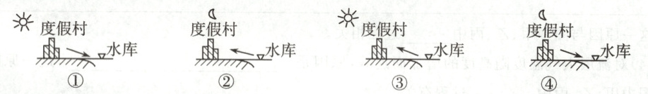 2. 若在该水库旁建一度假村,则下图中能正确反映水库与度假村之间风向的是(