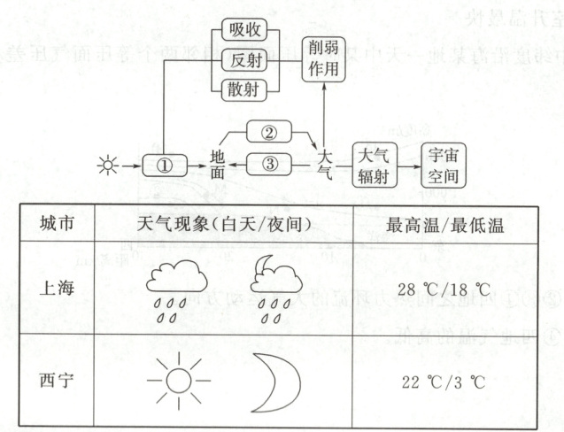 2. 与上海相比,说出西宁的昼夜温差特点,并运用大气受热过程的原理解释原因。
