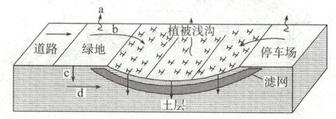 植被浅沟常布置在城市道路两侧和不透水地面周边等地,与城市雨水管网或集水池相连。下图为植被浅沟示意图,箭头表示水循环环节。读图,回答1~2题。