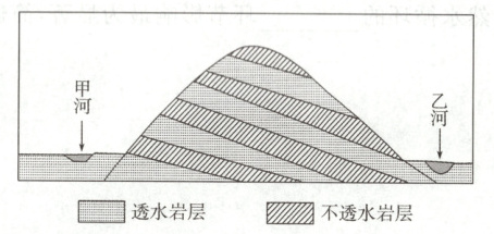 下图中的山地为甲、乙两条河流的分水岭,由透水和不透水岩层相间构成。在生态文明建设过程中,该山地被破坏的森林植被得以恢复,随之河流径流量发生了变化,河流径流的年内波动也减缓了。据此,回答3~5题。