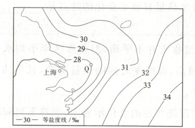 读我国长江入海口附近海域等盐度线分布图,回答 4~5 题。