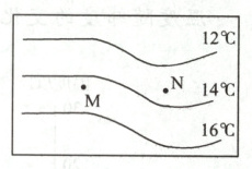 1. 若右图 M、N 表示陆地和海洋交界地区的等温线,叙述正确的是(