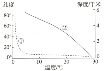 1. 曲线①代表表层海水温度随纬度的变化;曲线②代表海水温度随深度的变化。