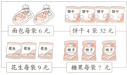 (4)用50元买了4袋饼干后,剩下的钱还能买几袋面包?