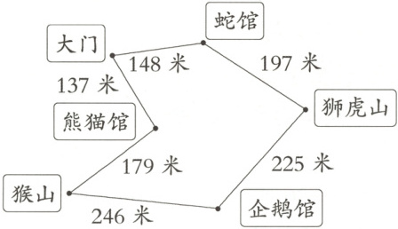 答:经过熊猫馆和猴山到达企鹅馆近,近8米。