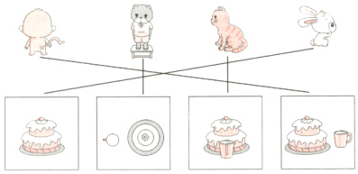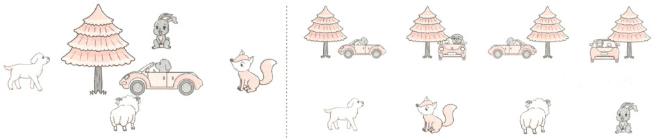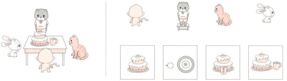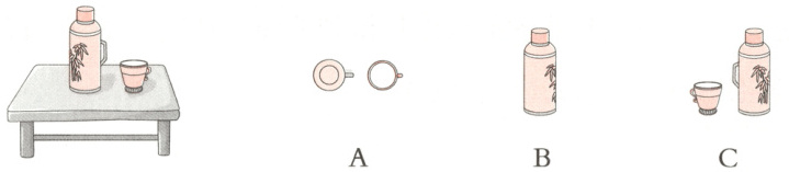 2. 小动物们从不同角度观察桌上的物品,你能从照片中判断它们分别看到了什么吗? 连一连。(8分)