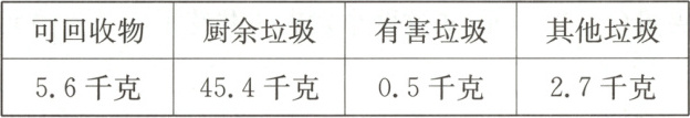 4. 新角度 开放题 做好垃圾分类,共创文明新风。淘气家所在的小区实行了垃圾分类,淘气将8月份家里产生的可回收物、厨余垃圾、有害垃圾和其他垃圾进行了分类整理,结果如下表。