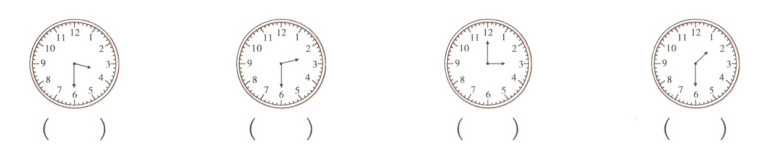 1. 下面哪个钟面上的指针所形成的角最大?画“$◯$”。哪个钟面上的指针所形成的角最小?画“$\surd$”。(4分)