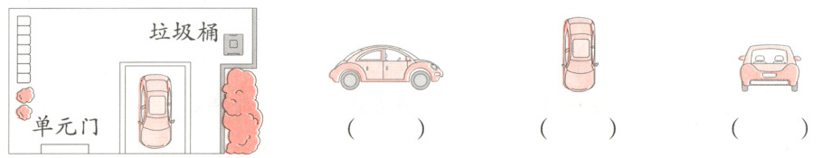 4. 如图,龙龙在阳台看到楼下停着一辆车,下去扔垃圾时从这辆车的旁边和后面路过。龙龙看到车的先后顺序是怎样的?用序号①②③表示。(6分)