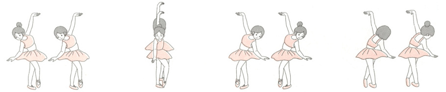 5. 两个小朋友在跳舞,下面有三张照片是从不同位置同时拍摄的,另外一张照片的动作与这三张不同,请你找出动作不同的那张。圈一圈。(5分)